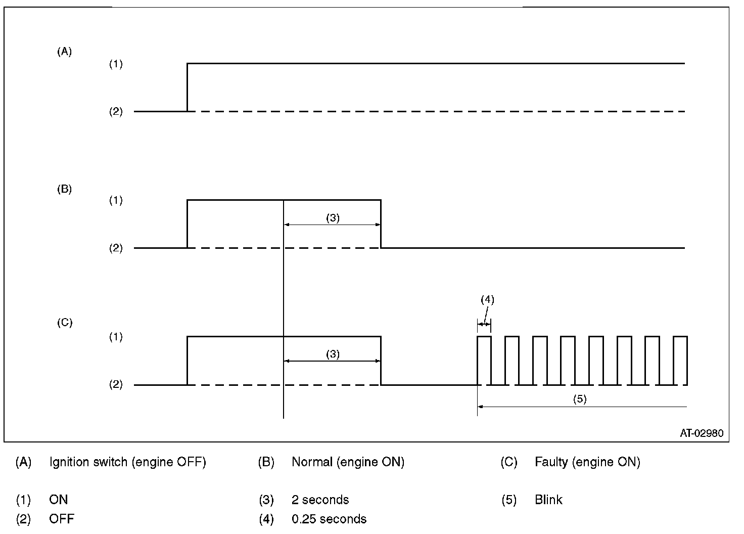 When any on-board diagnostics item is malfunctioning, the AT OIL TEMP light blinks. The light keeps blinking from when the malfunction is detected after starting the engine, until the ignition switch is turned OFF. The faulty parts or unit can be identified by reading DTCs. Problems which occurred previously can also be identified through the memory function. If the AT OIL TEMP light does not blink although a problem is occurring, the problem can be determined by checking the performance characteristics of each sensor using the Subaru Select Monitor. Indicator light signal patterns are as shown in the figure.