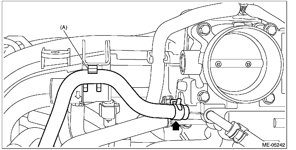 12) Connect the preheater hose to throttle body and install the preheater hose to intake manifold clip (A).