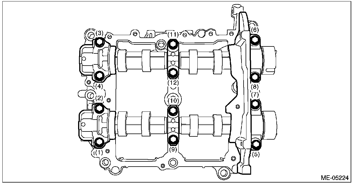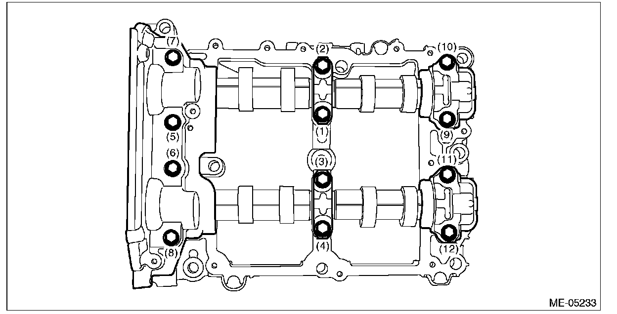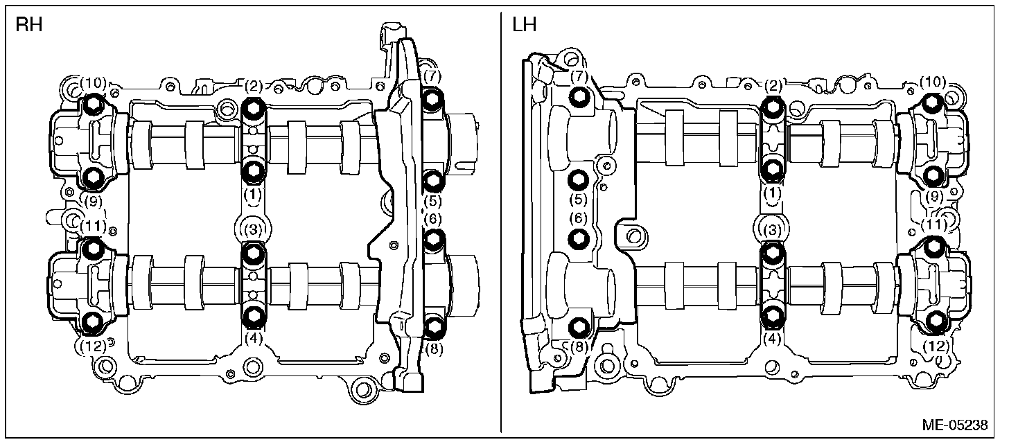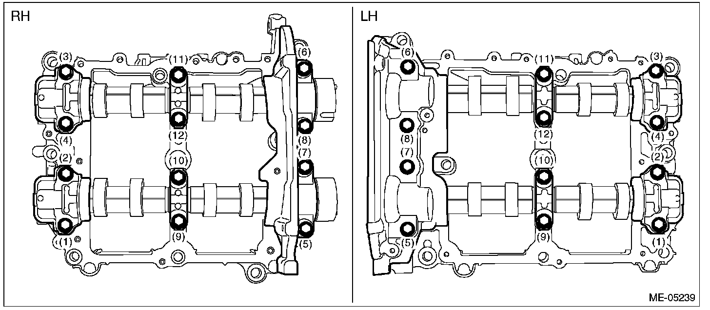 1) Loosen the bolts (front camshaft cap LH, intake center camshaft cap LH, intake rear camshaft cap LH, exhaust center camshaft cap LH and exhaust rear camshaft cap LH) equally, a little at a time in numerical sequence as shown in the figure, and remove the camshaft cap.