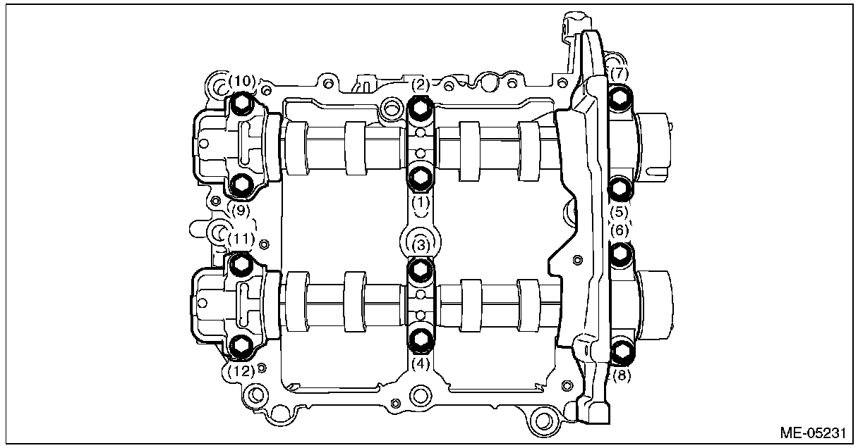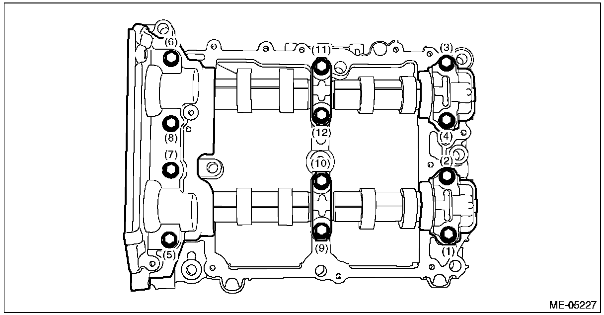 (5) Tighten the bolts which secure front camshaft cap, intake center camshaft cap, intake rear camshaft cap, exhaust center camshaft cap and exhaust rear camshaft cap in numerical order as shown in the figure.