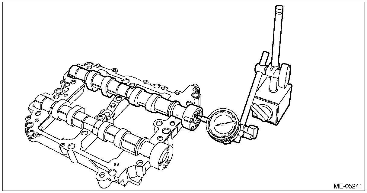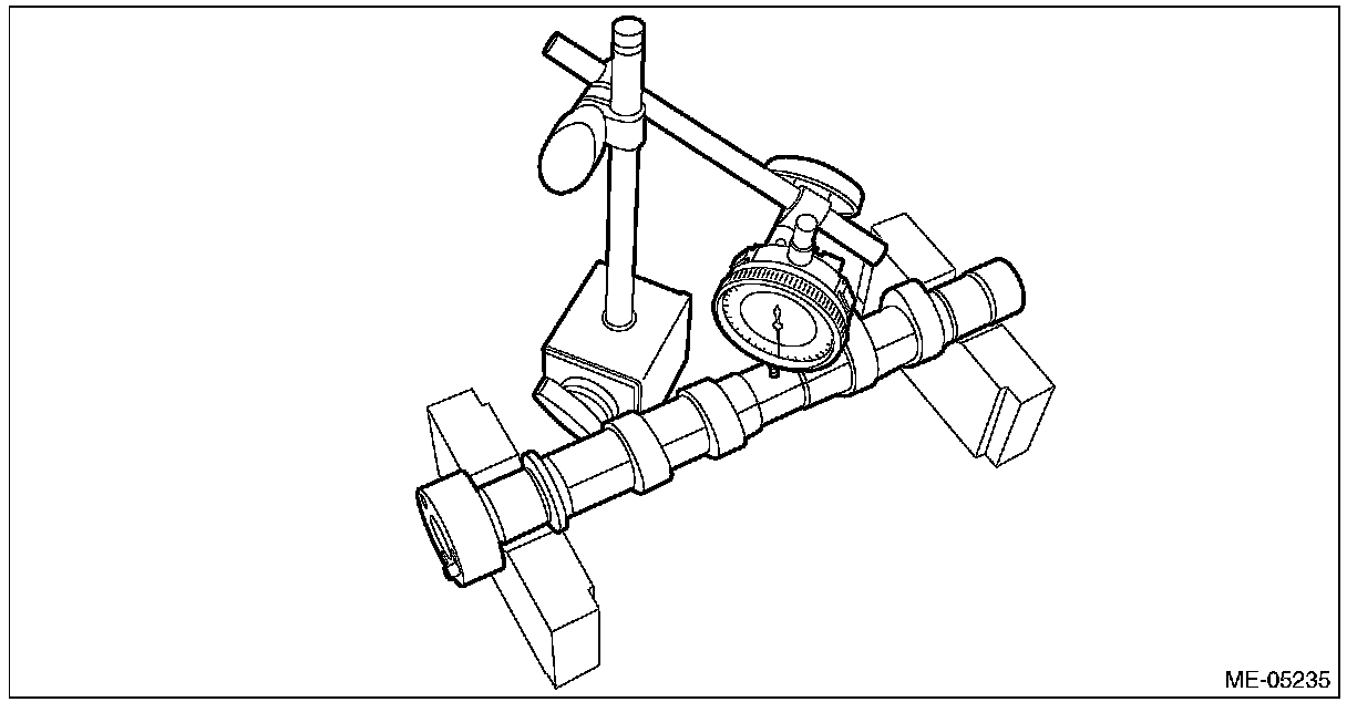 4) Using a dial gauge, check the camshaft bend. If it exceeds the limit, replace the camshaft.