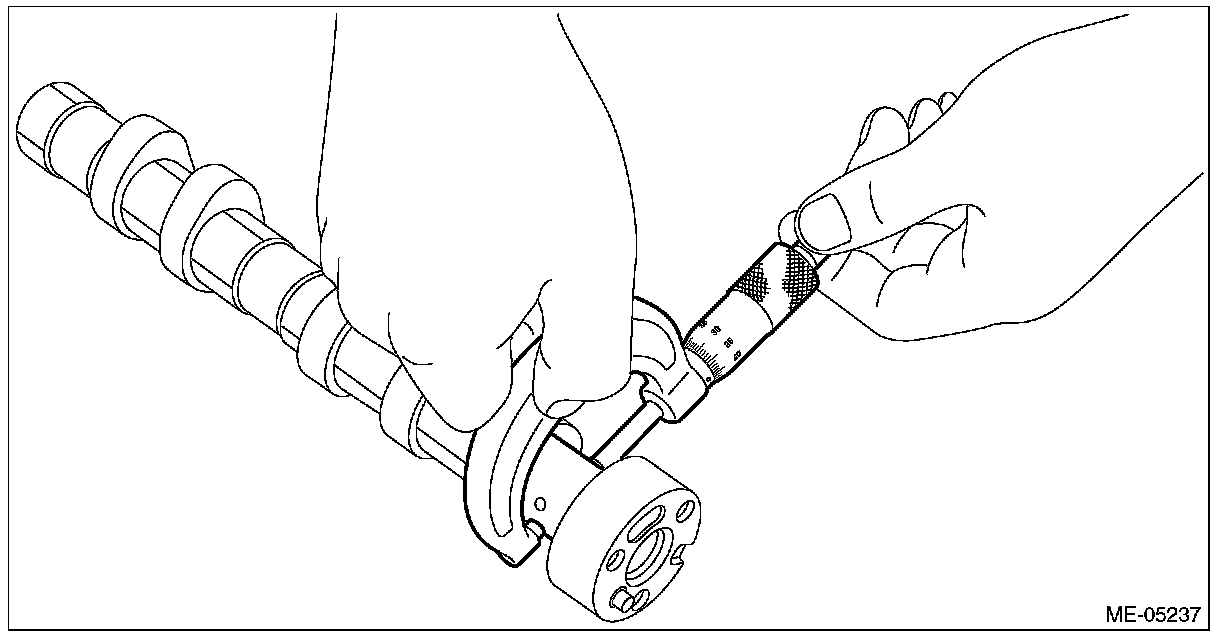 6) Check the camshaft journal outer diameter using micrometer. If it is not within the standard, check the oil clearance. Refer to step 7) for inspection procedure of oil clearance.
