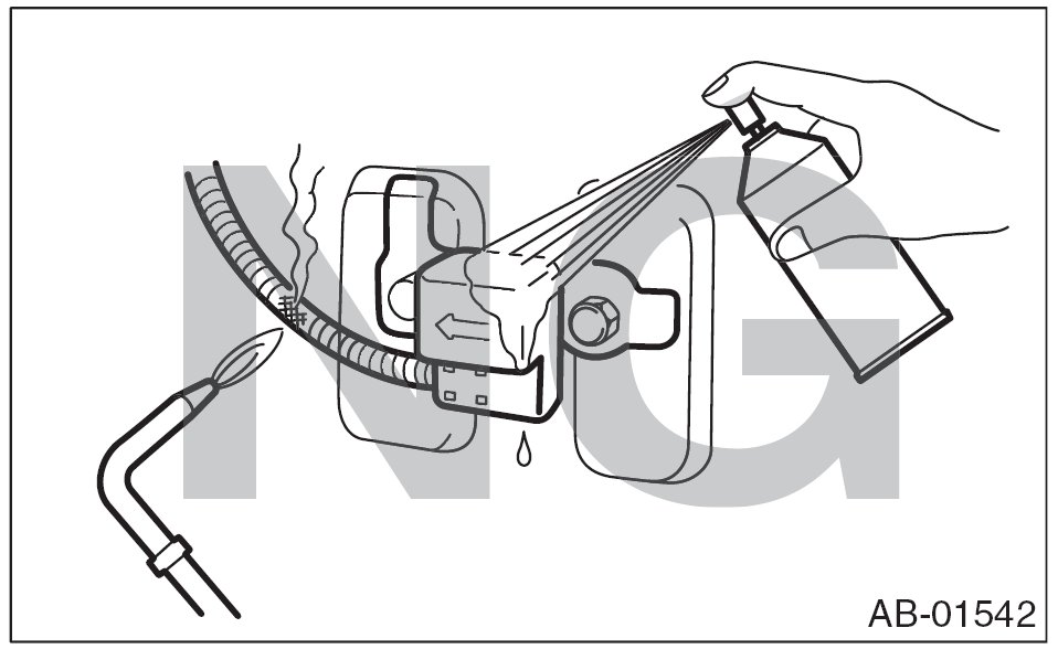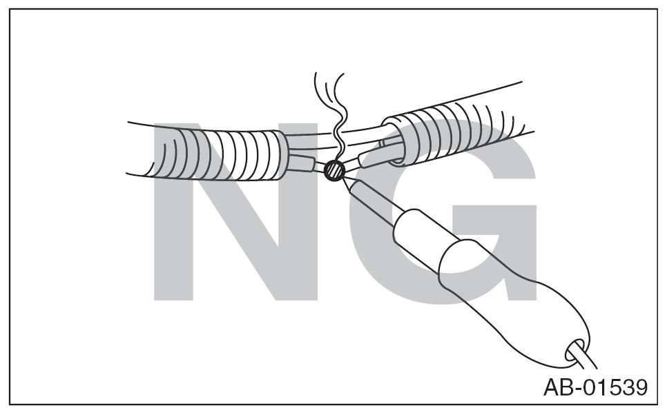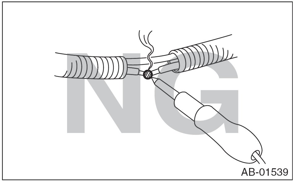- If damage, open circuit or rust is found on airbag system wiring harness, do not use a soldering equipment to repair. Replace the faulty harness with a new genuine part.