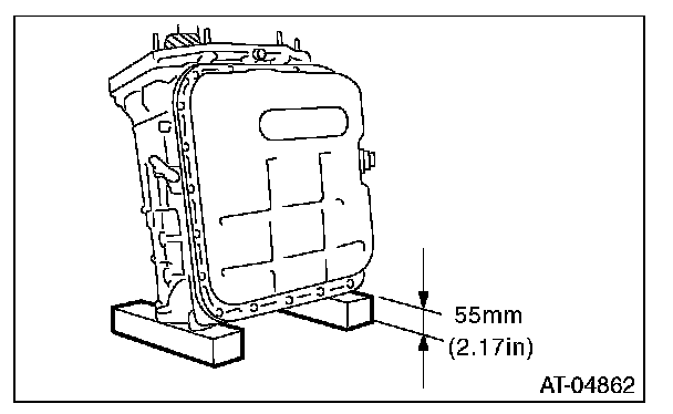 13) Place two wooden blocks on the workbench, and stand the transmission case with the rear end facing down.