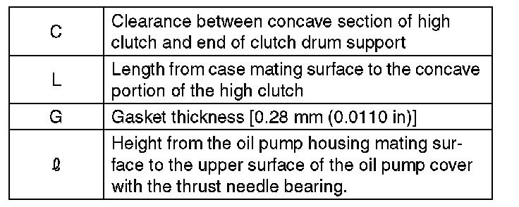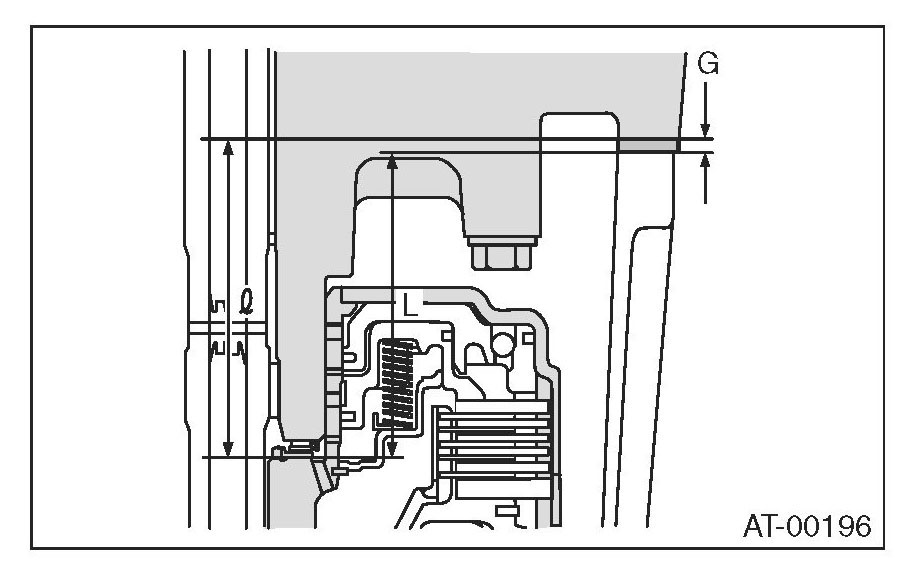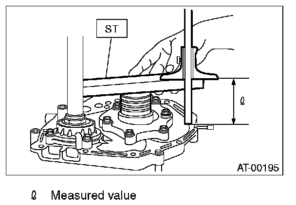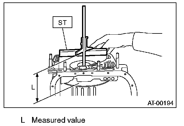 1) Using the ST, measure the length "L", from the mating surface of the transmission case to the recessed portion of the high clutch drum.