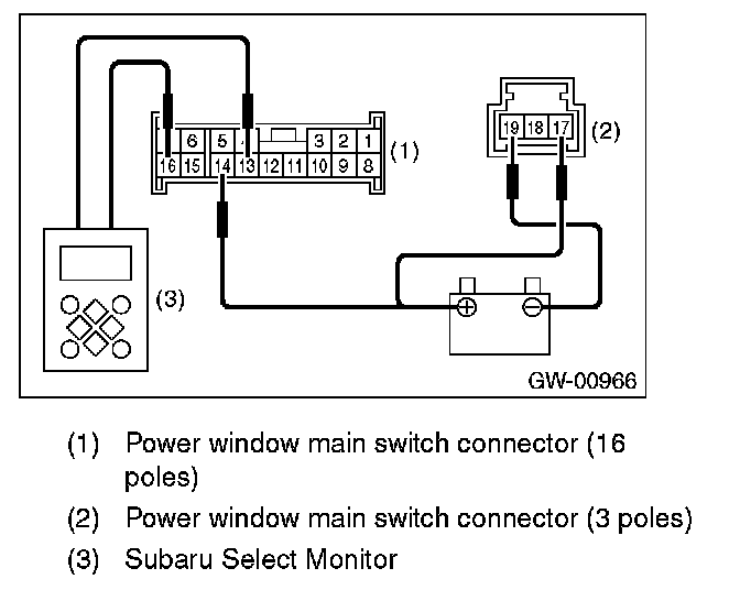 3. Connect the battery and the Subaru Select Monitor to the power window main switch connector.