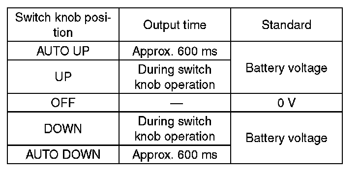 NOTE: Since output time during window UP operation is extremely short, it cannot be checked without using a measuring instrument such as oscilloscope. Output is constantly produced while the knob is operated for window DOWN operation.