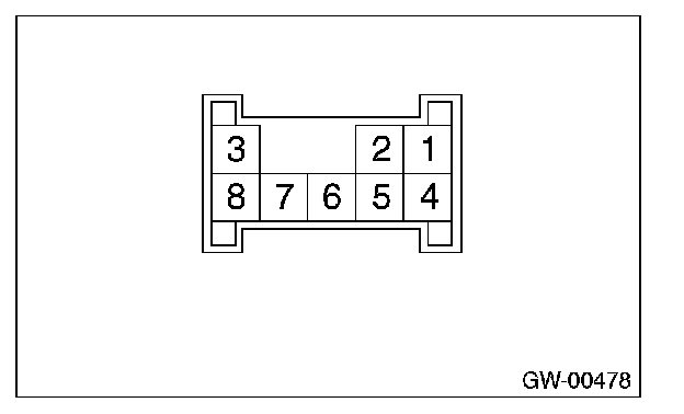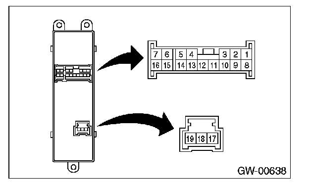 CAUTION: Never mix up the terminals when connecting the power window main switch connector and battery. If connected to a wrong terminal, the power window main switch may be damaged.