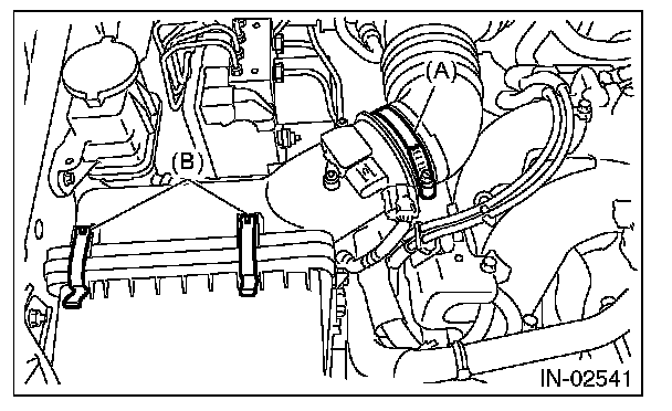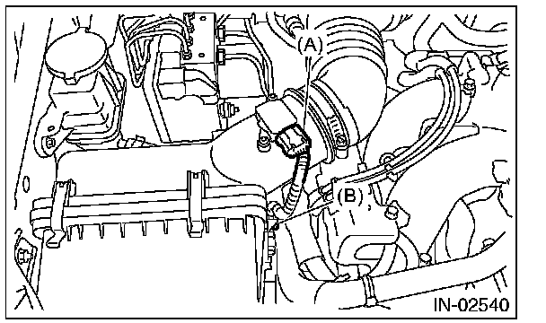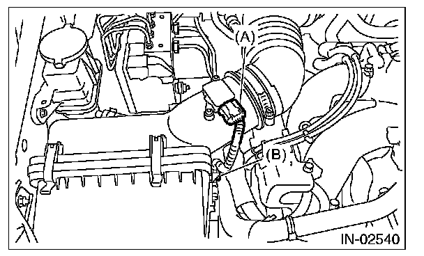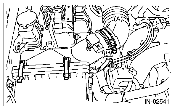 3. Disconnect the connector (A) from the mass air flow and intake air temperature sensor, and remove the clip (B).