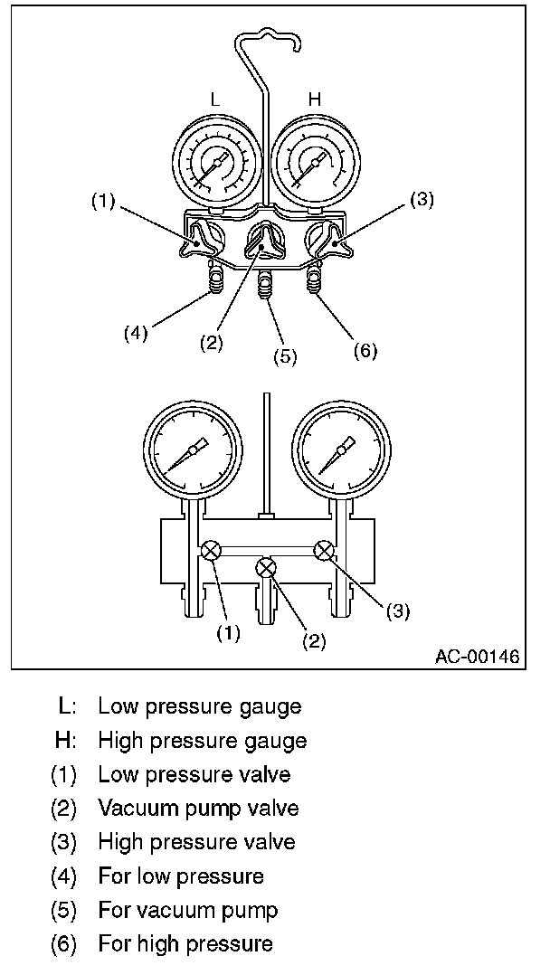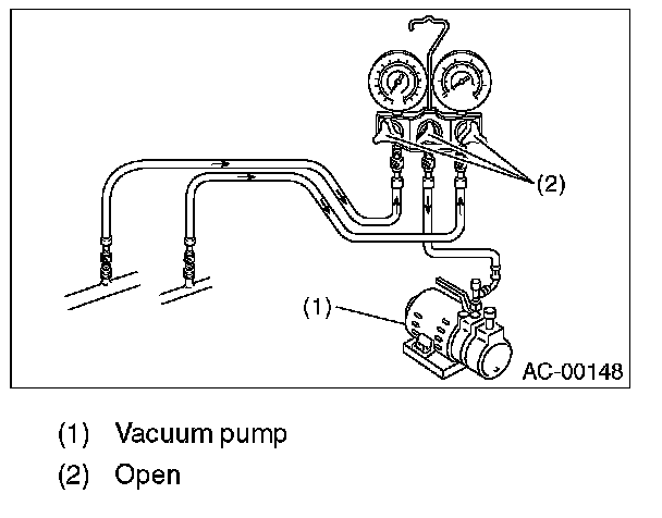 4. Operate the vacuum pump and open the low pressure and high pressure side valves. Next, open the center manifold hose valve, and begin evacuation.