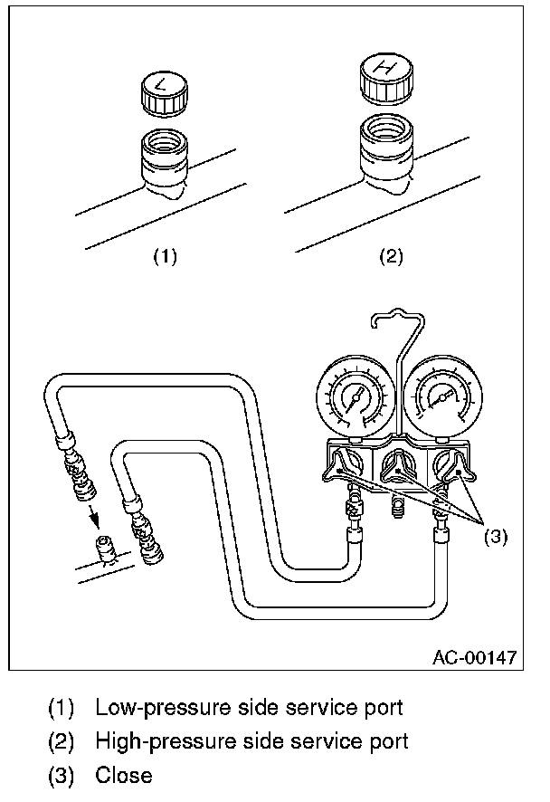 CAUTION: When filling with the engine running, do not open the high pressure side valve. Always fill from the low pressure side.