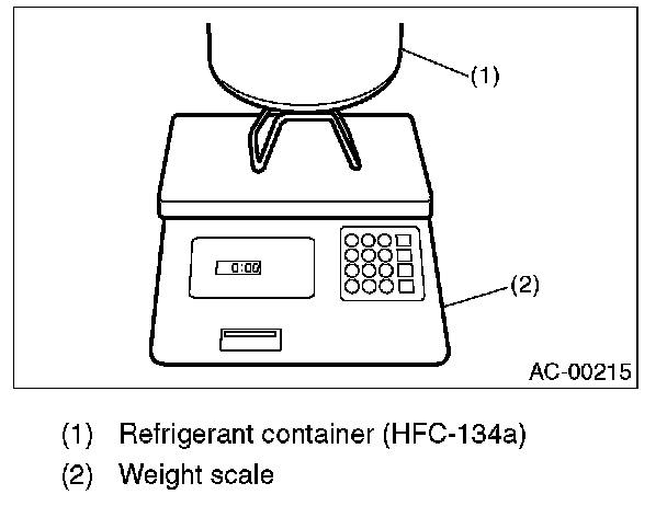 11. When a 13.6 kg (30 lb) refrigerant container is used, measure the amount of refrigerant with a refrigerant charging scale, and connect with the center manifold hose.