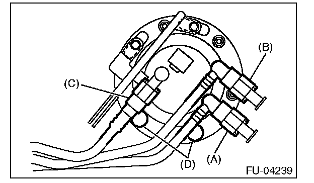 7. Disconnect the quick connectors of fuel delivery tube (A), fuel return tube (B), and jet pump tube (C).