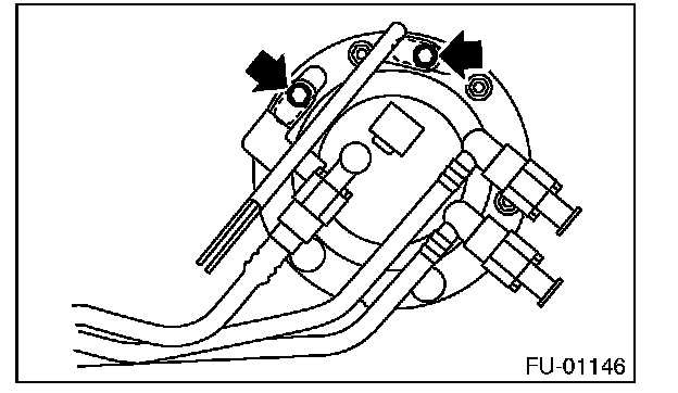 9. Remove the bolts and nuts which hold fuel sub level sensor protector and fuel sub level sensor upper plate to the fuel tank.