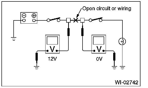 open circuit is determined by measuring the voltage between respective connectors and ground using a voltmeter, starting with the connector closest to the power supply. The power supply must be turned ON so that current flows in the circuit. If voltage is not present between a particular connector and ground, the circuit between that connector and the previous connector is open.