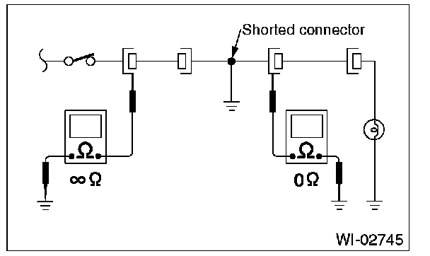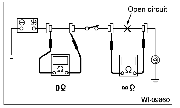 Disconnect all connectors affected, and check continuity in the wiring between adjacent connectors. When the ohmmeter indicates infinite , the wiring is open.