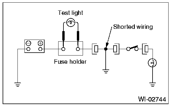 Connect a test light (rated at approx. 3 watts) in place of the blown fuse and allow current to flow through the circuit. Disconnect one connector at a time from the circuit. Starting with the one located farthest from the power supply. If the test light goes out when a connector is disconnected, the wiring between that connector and the next connector (farther from the power supply) is shorted.