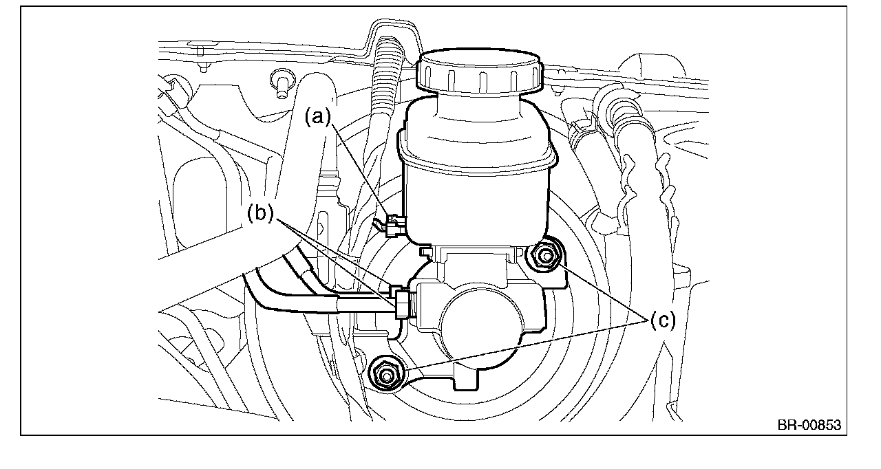 (3) Remove the nut (c), and slowly remove the master cylinder from the brake booster.
