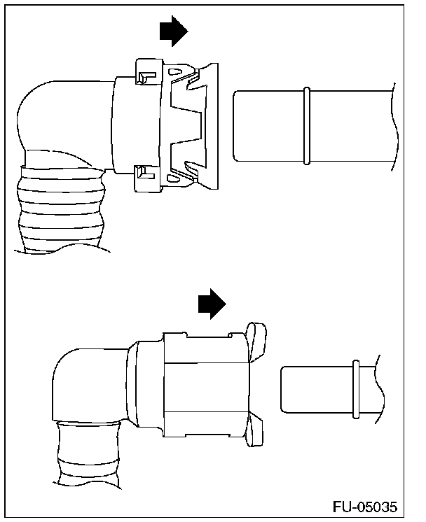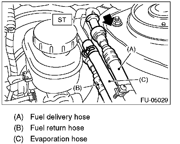 3. Disconnect the quick connector of the fuel delivery hose and fuel return hose by pushing the ST in the direction of the arrow.