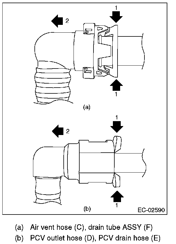 8. Remove the purge hose (A), purge pipe (B), air vent hose (C), PCV outlet hose (D), PCV drain hose (E) and drain tube assembly (F).