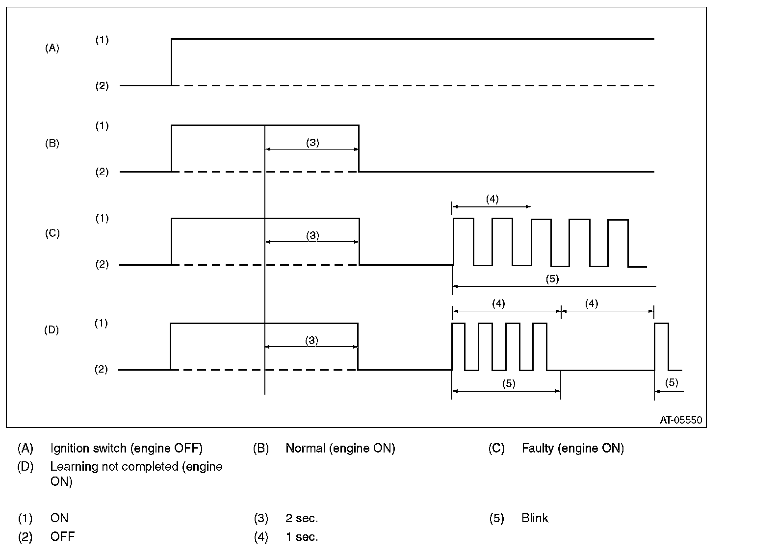 When any on-board diagnostics item is malfunctioning, or the learning has not yet completed, AT OIL TEMP light blinks. Blinking continues from the engine start to the ignition switch OFF. The malfunctioning part or unit can be determined by a DTC. Problems which occurred previously can also be identified through the memory function. If the AT OIL TEMP light does not blink although a problem is occurring, the problem can be determined by checking the performance characteristics of each sensor using the Subaru Select Monitor. If the learning has not yet completed, "AT learning not completed" is displayed when the Subaru Select Monitor is connected while AT OIL TEMP light is blinking. The AT OIL TEMP light blinking will go off, when the learning is performed. Indicator light signal patterns are as shown in the figure.