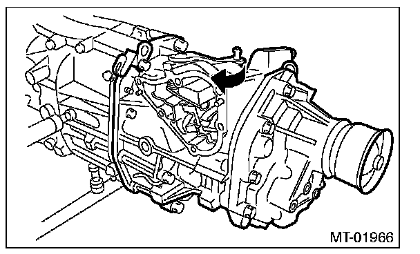 (2) Set and hold the selector lever to the 1st-2nd side, and install the transfer case assembly so that the shifter arm edge and fork rod does not contact.