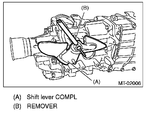 19) Install the shift lever COMPL to the shifter arm No. 2, then insert the remover or similar tool instead of spring pin.