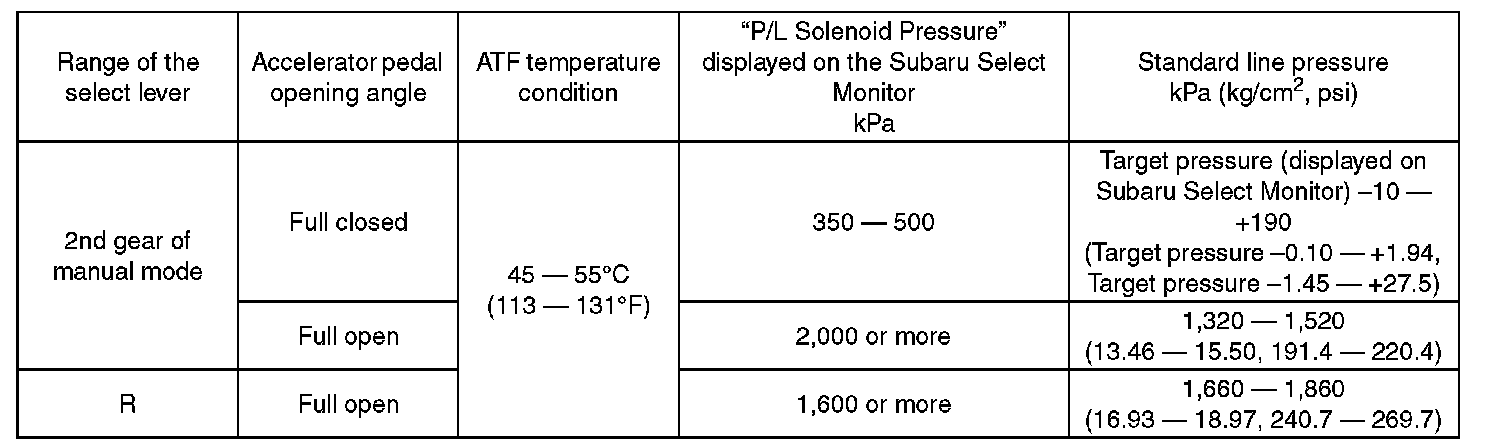 ^ After performing the line pressure test, be sure to cool down the engine for at least one minute with the select lever set in "P" or "N" range and with the idle speed at 1,200 rpm or less.