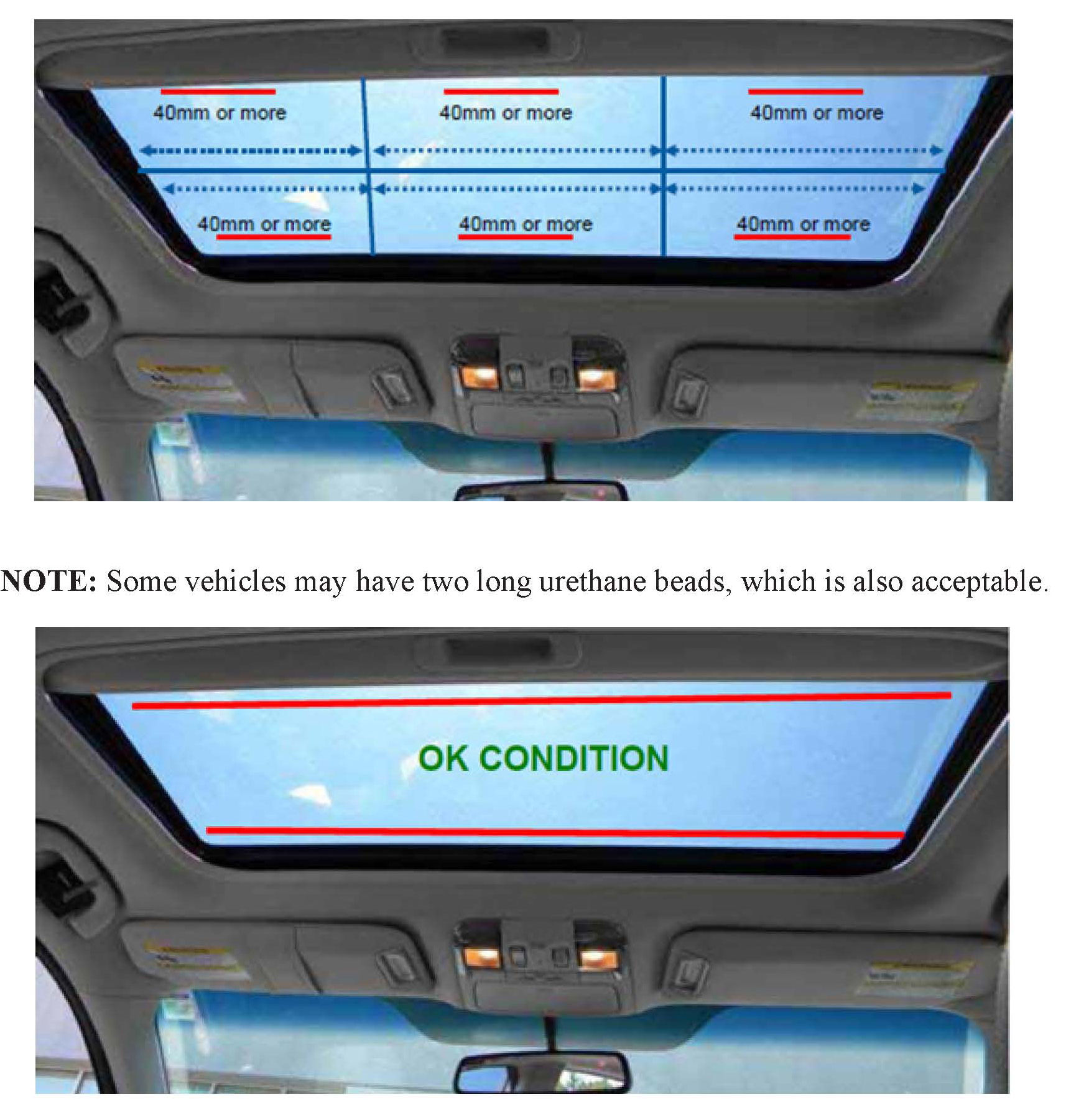 Some vehicles may have two long urethane beads, which is also acceptable