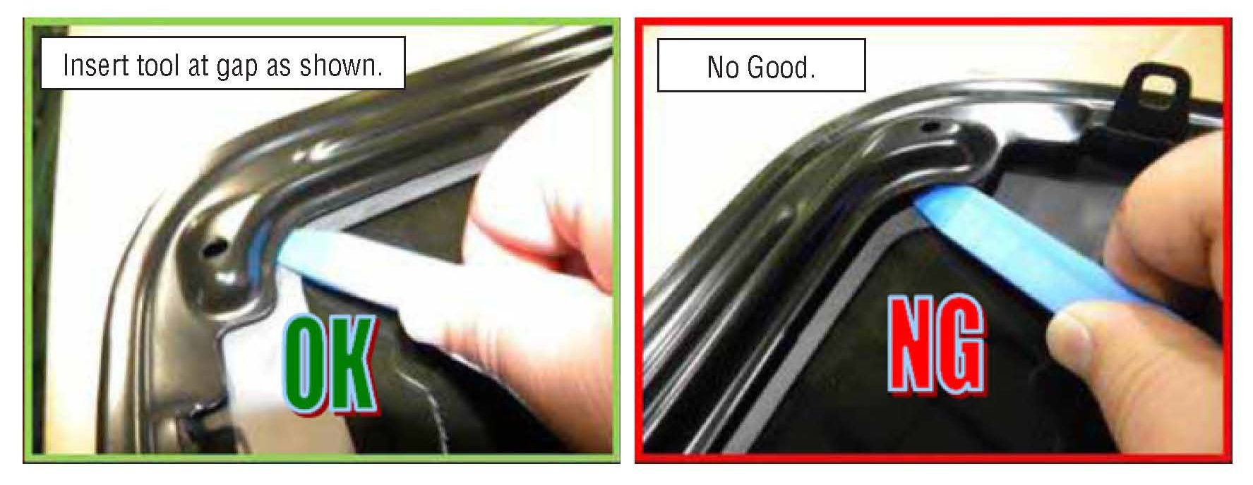 ^ Insert the plastic trim tool between the frame and glass starting at the front left corner.