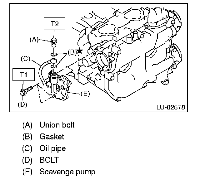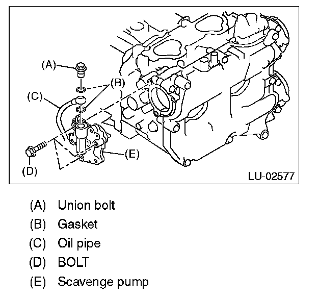 3) Remove the union bolt (A) that holds the oil pipe (C) to the scavenge pump (E).