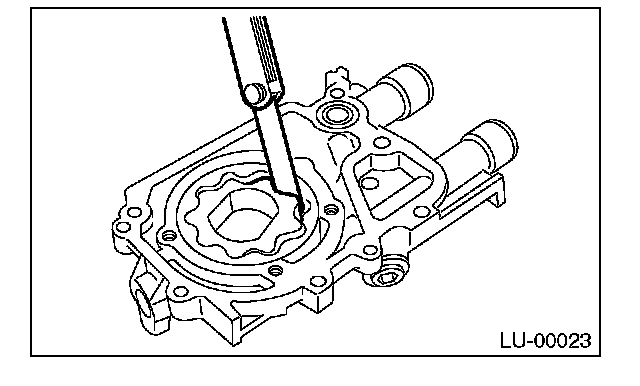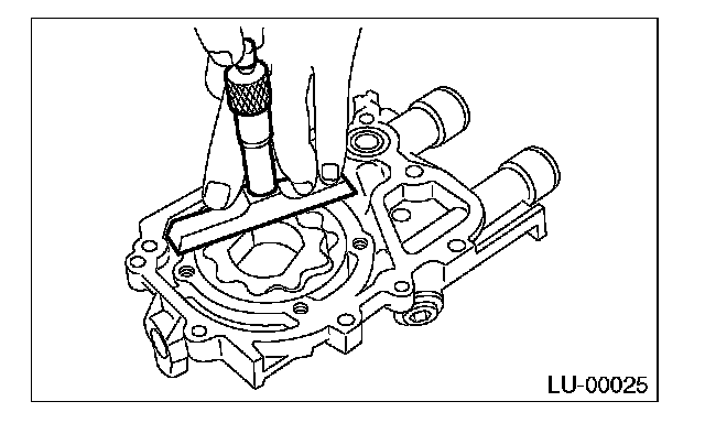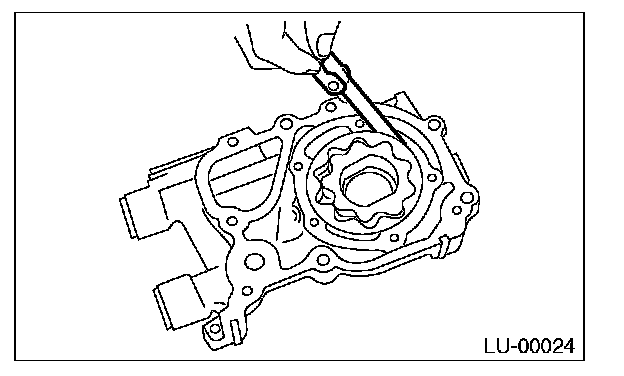 Measure the gap between the inner rotor and the oil pump case to measure the clearance between the inner rotor and the oil pump cover as shown in the figure. If clearance is out of standard, replace the rotor or the oil pump case.