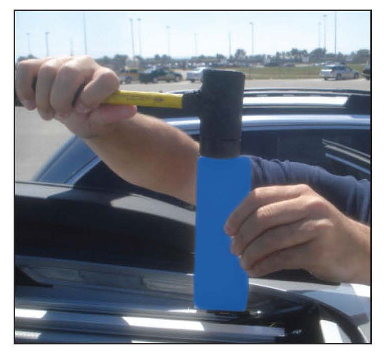 3) Strike the top of the block with a hammer 3 to 4 times. Check the operation of the sunroof glass. If the wedge cap is still out of adjustment, strike the block with additional force. Caution: Too much force can crack the wedge cap.