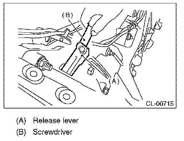 6) Remove the lever spring from the pivot with a screwdriver by accessing it through the clutch housing release lever hole. Then remove the release lever and release bearing as a unit. (turbo model)
