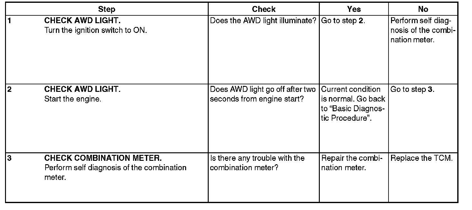 If the AWD light does not illuminate, or illumination patterns are not as above, check the AWD light circuit.