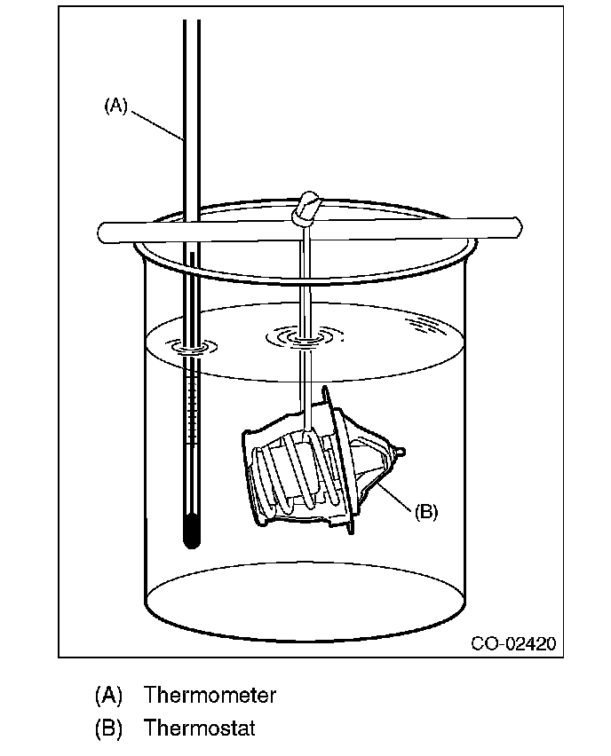 3) Immerse the thermostat and a thermometer in water. Raise water temperature gradually, and check the temperature and valve lift when the valve begins to open and when the valve is fully opened. Replace the thermostat if faulty.