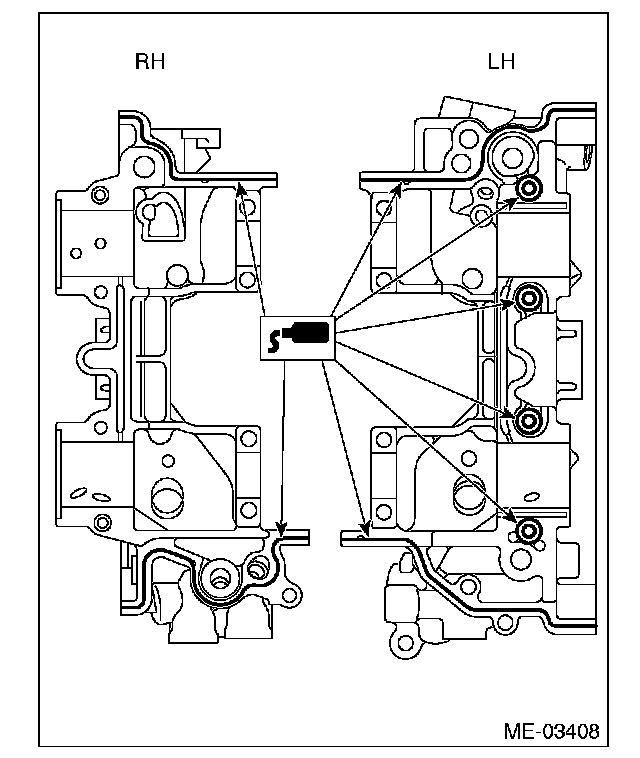 ^ Do not apply liquid gasket excessively. Applying excessively may cause excess gasket to come out and flow toward cam journal, resulting in engine seizure.