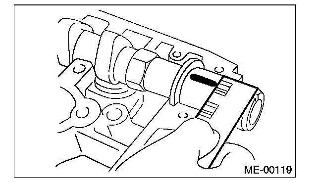 8) Measure the thrust clearance with setting the dial gauge at end surface of camshaft. If the thrust clearance is not within the standard or there is offset wear, replace the camshaft caps and cylinder head as a set. If necessary replace the camshaft.