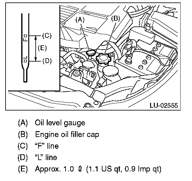 11) After the engine stops, recheck the oil level. If necessary, add engine oil up to the "F" line on level gauge.