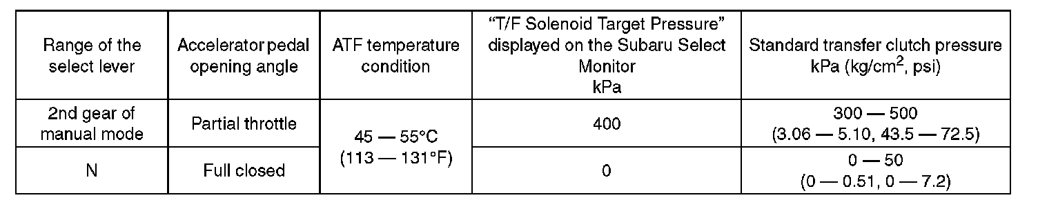 ^ Adjust the accelerator pedal opening angle in order to obtain the "T/F solenoid target pressure" displayed on the Subaru Select Monitor.