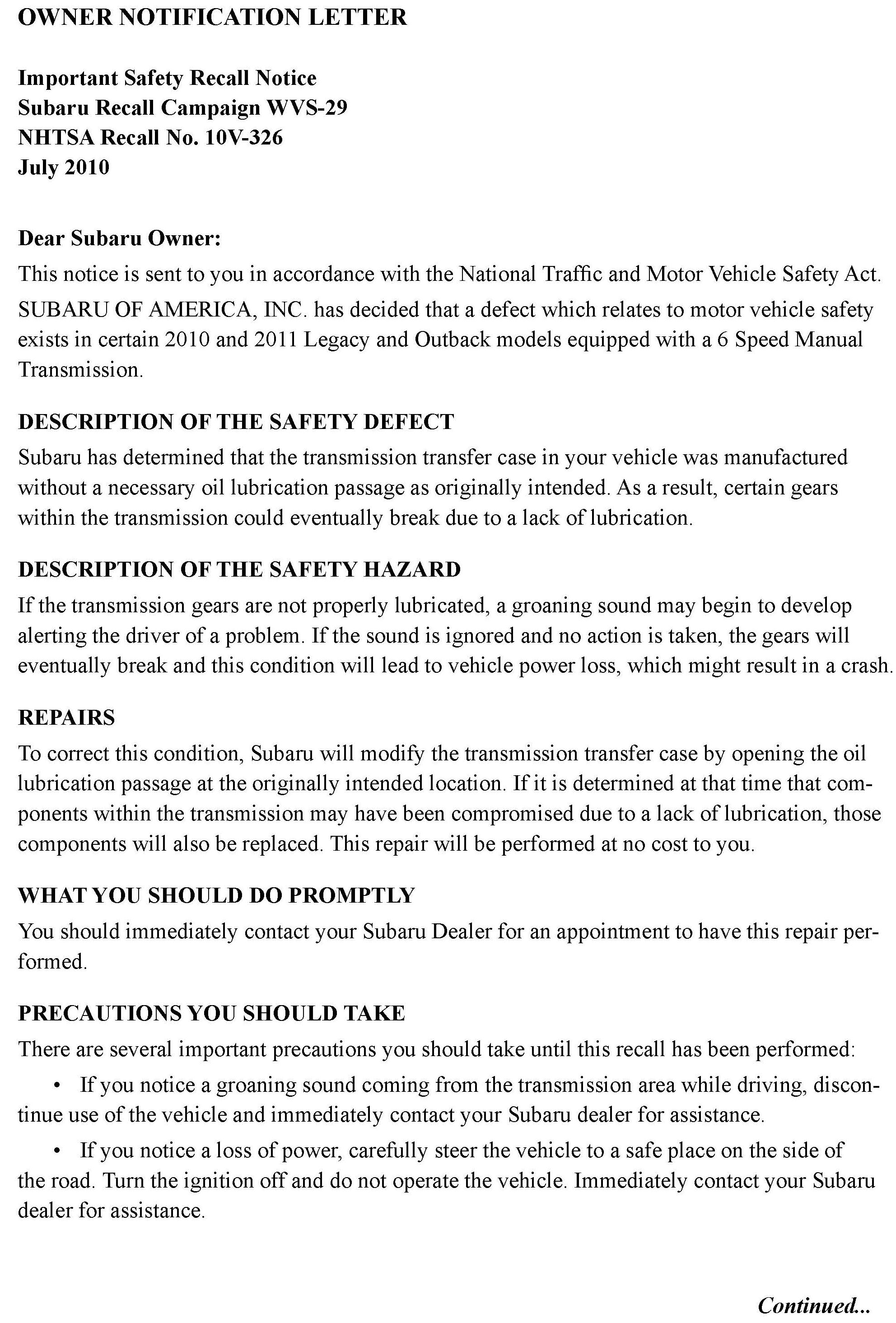 Subaru of America, Inc. has determined that certain 2010 & 2011 Legacy and Outback models equipped with a 6 speed manual transmission were produced with a transmission transfer case that was manufactured without a necessary oil lubrication passage. As a result, certain gears within the transmission could eventually break due to a lack of lubrication. This recall will involve modifying the transmission transfer case by opening the oil lubrication passage at the originally intended location.