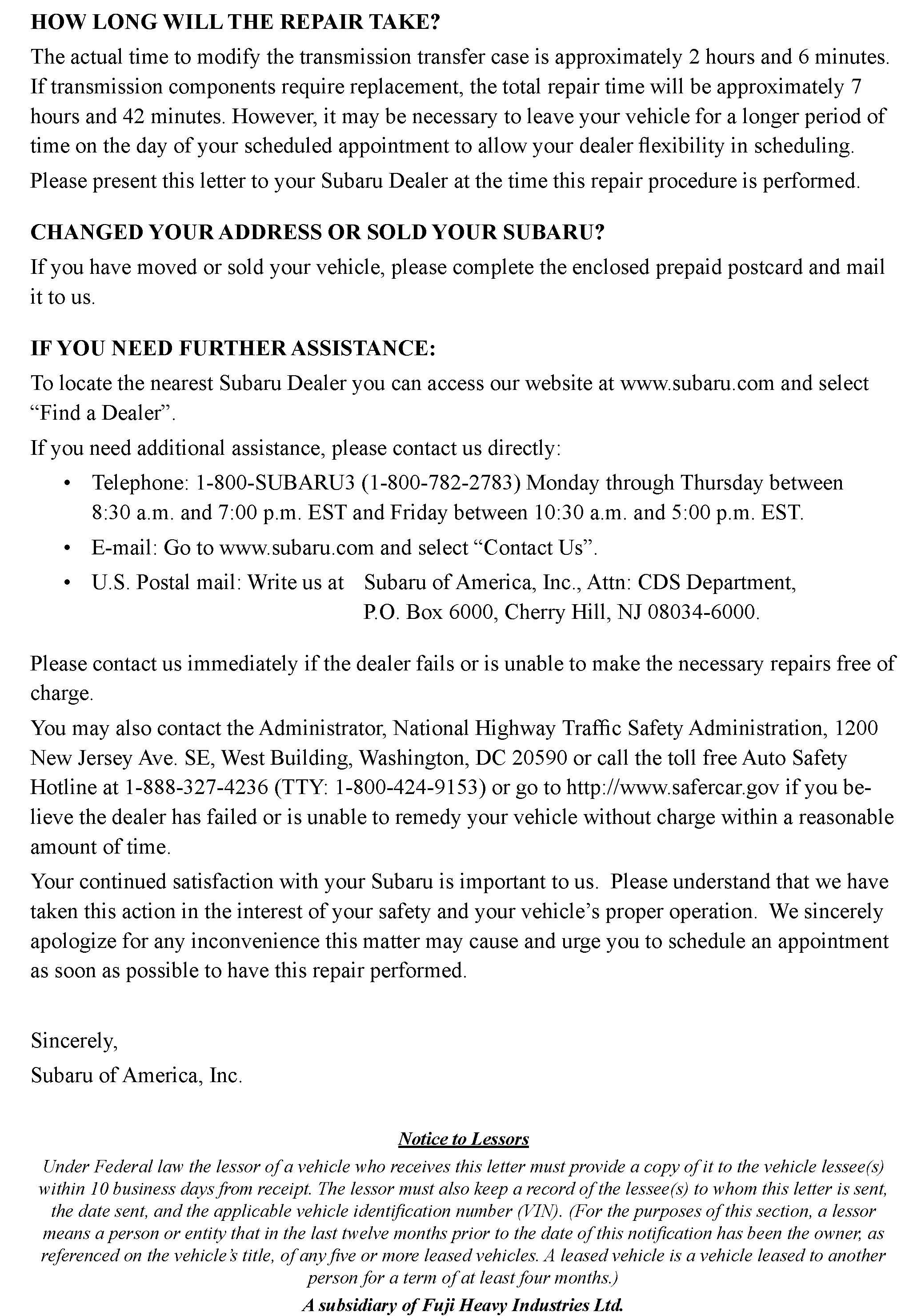 Please be advised that it is a violation of Federal law for a dealer to deliver a new motor vehicle covered by a recall under a sale or lease until the defect is remedied. Therefore, any Authorized Subaru Dealer failing to perform the applicable service procedures as defined in this bulletin to correct all affected vehicles in their inventory (new, used, demo) prior to the vehicle being placed in service may be subject to civil penalties of up to $6,000 per violation (i.e., for each vehicle), as provided in 49 CFR section title (symbol) 578.6 and will also be in breach of the Subaru Dealer Agreement.