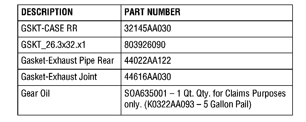 4) Referring to the applicable Service Manual, remove the transmission from the vehicle and follow the repair procedure for replacing the main shaft along with the 3rd & 4th, 5th and 6th gear sets including bearings, sleeves and hubs, and syncro set. Since the gears are supplied as sets, it is also necessary to replace related gears on the Pinion Shaft. (Parts requiring replacement are contained in the "Transmission Gears and Gasket Set" part number 32001AA360. In addition, part numbers 803520030 - qty 1 (Locking Washer - Pinion Shaft) and 802620100 - qty 1 (Locking Nut - Pinion Shaft) are also required.)