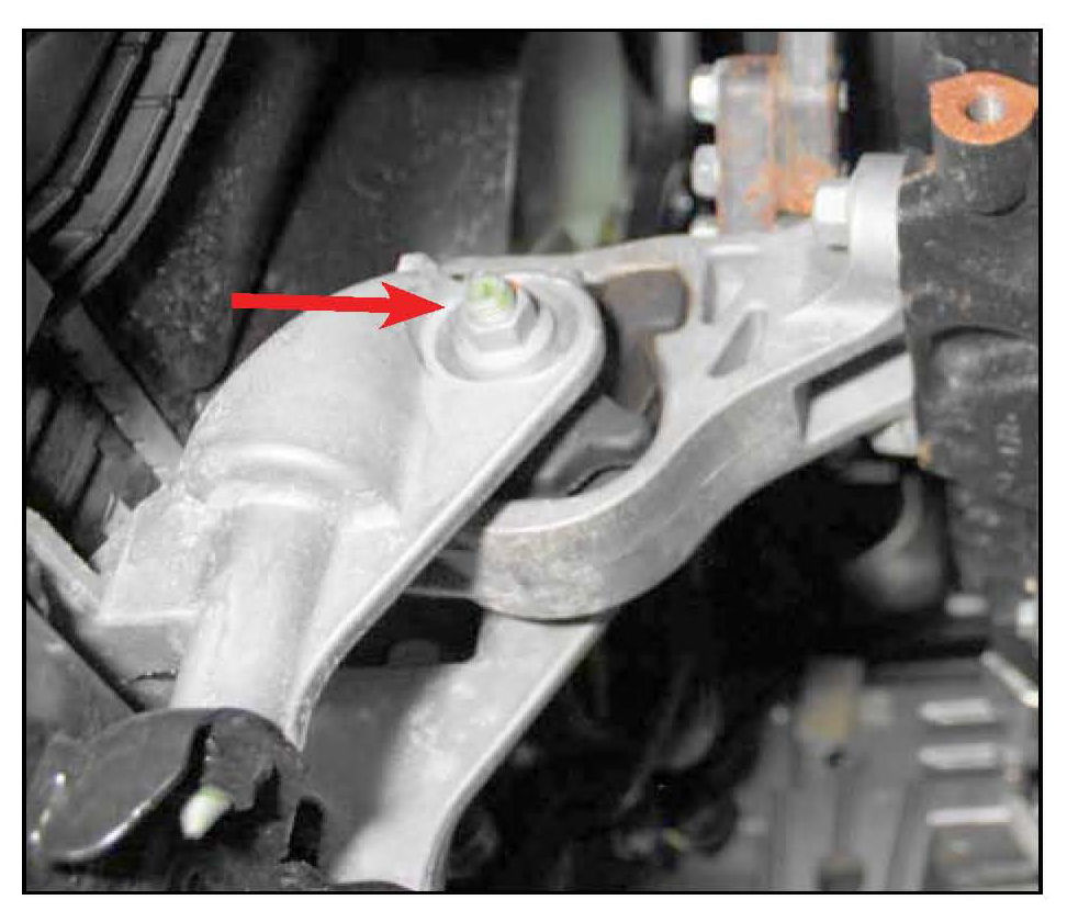 5) With engine weight supported by ST, remove the horizontal bolt from the front engine mount.