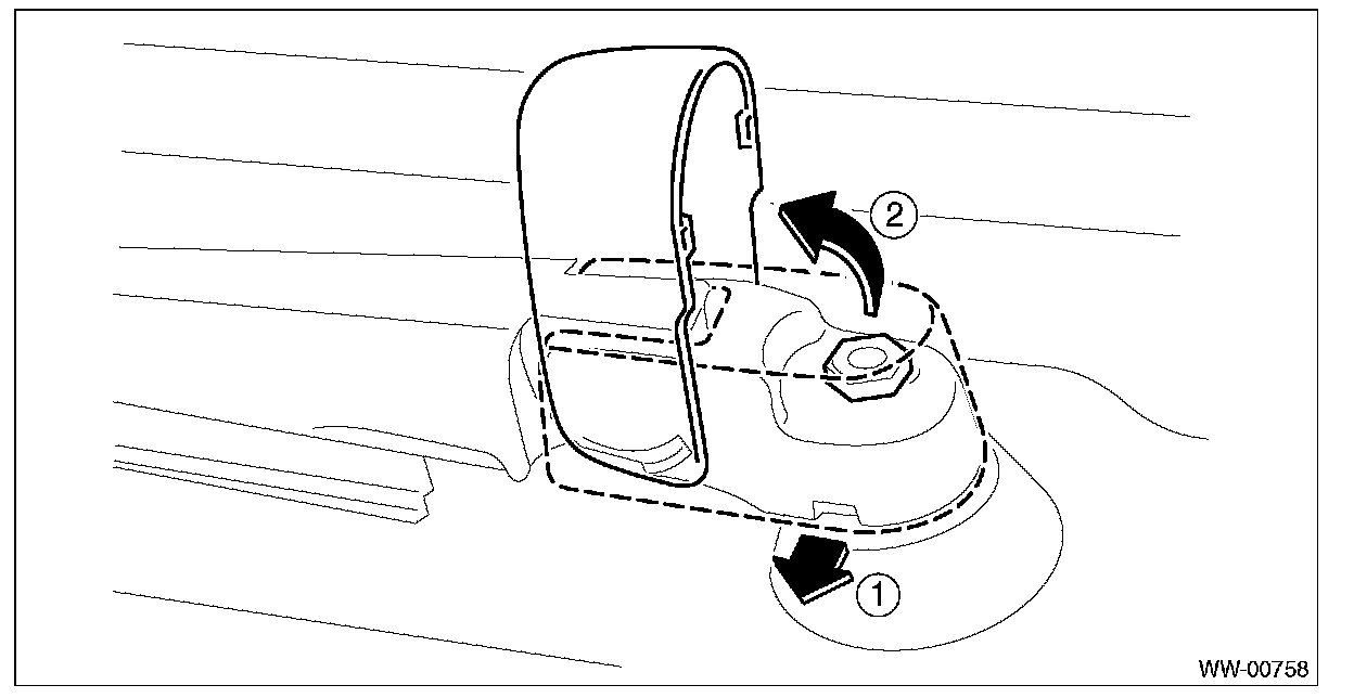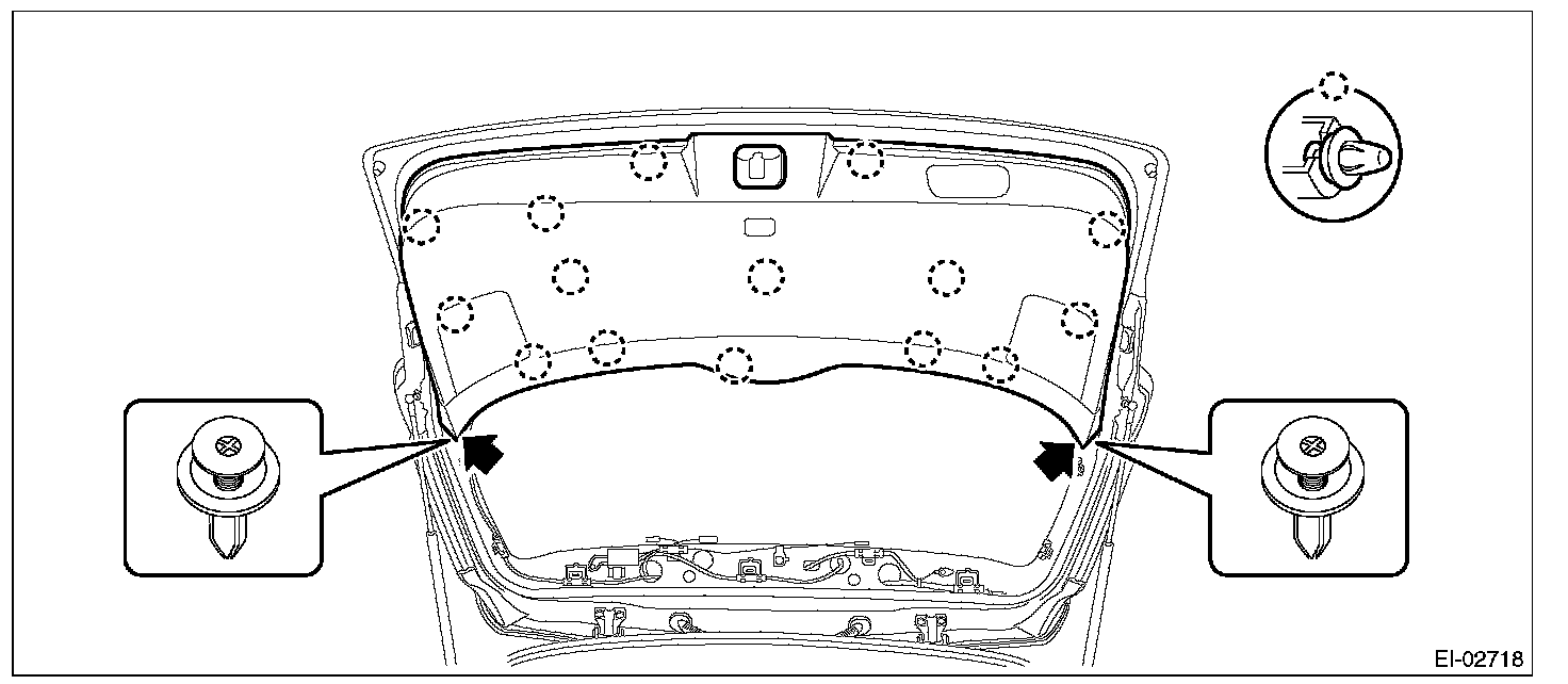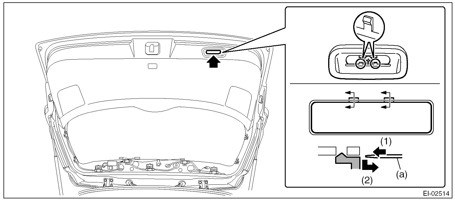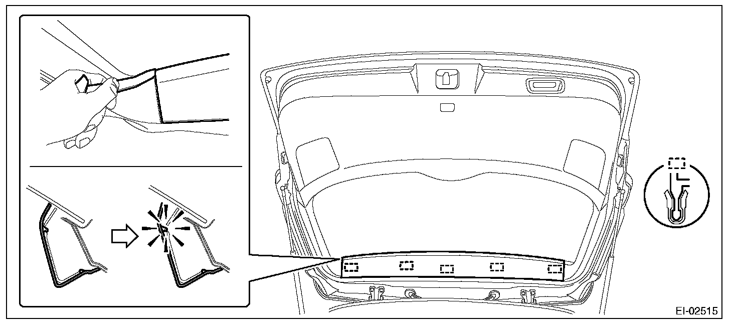 b. Disconnect the claws in the center of trim, and remove the rear gate upper trim.
