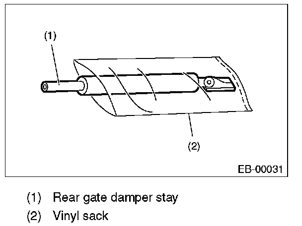 2. Lift the body side slightly with piston rods fully extended, and secure the body side with vise. Drill a hole in 2 to 3 mm (0.08 to 0.12 in) diameter at a point 10 to 200 mm (0.39 to 7.87 in) from body side, and bleed the rear gate damper stay gas completely.