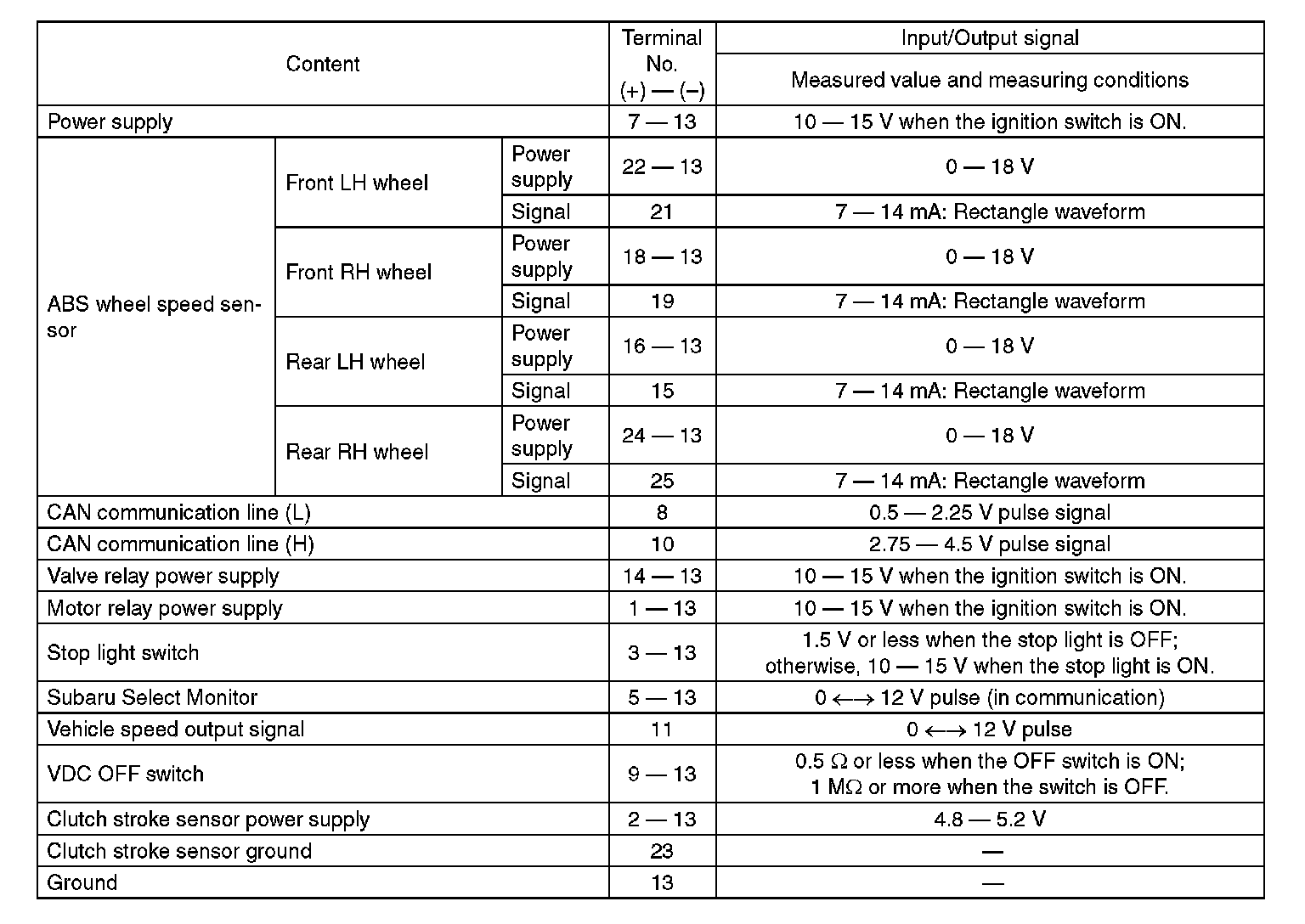Control Module I/O SignalELECTRICAL SPECIFICATION