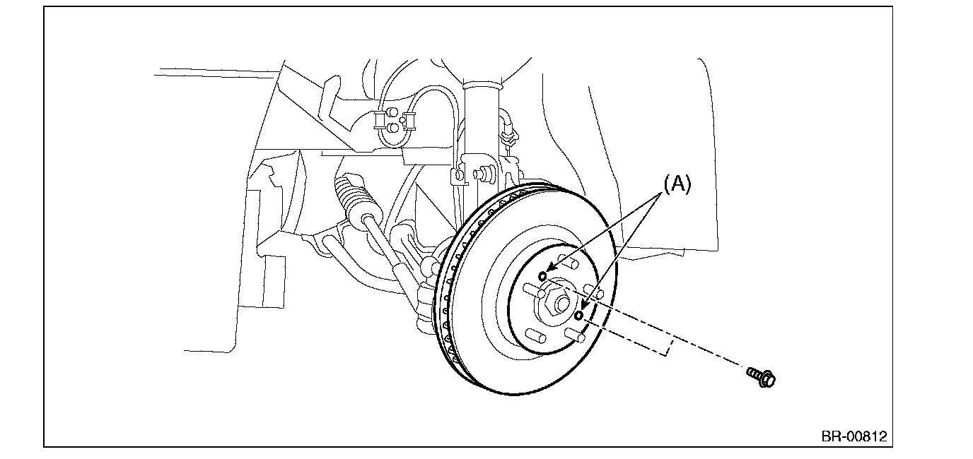 When the disc rotor is difficult to be removed from the front hub unit bearing, screw in 8 mm (0.31 in) bolt to the threaded part of the disc rotor (A), and remove the disc rotor.