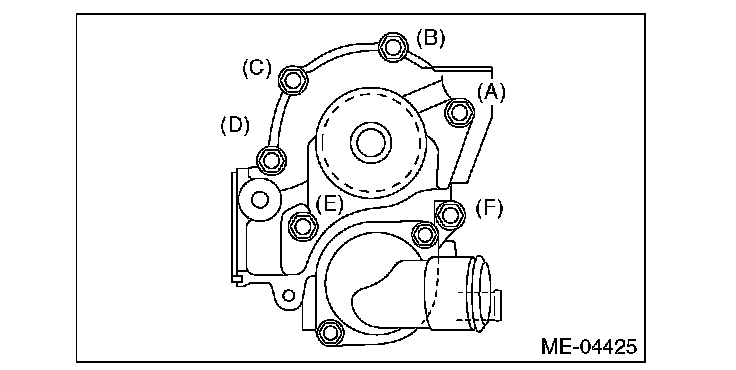 ^ When installing the water pump, tighten bolts in two stages in alphabetical order as shown in the figure.