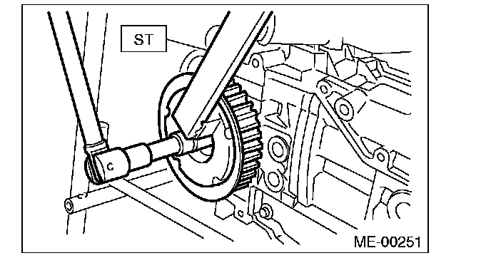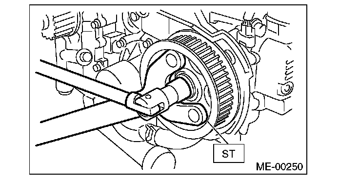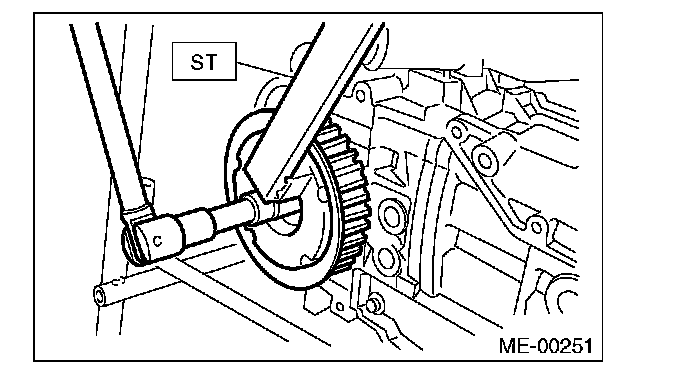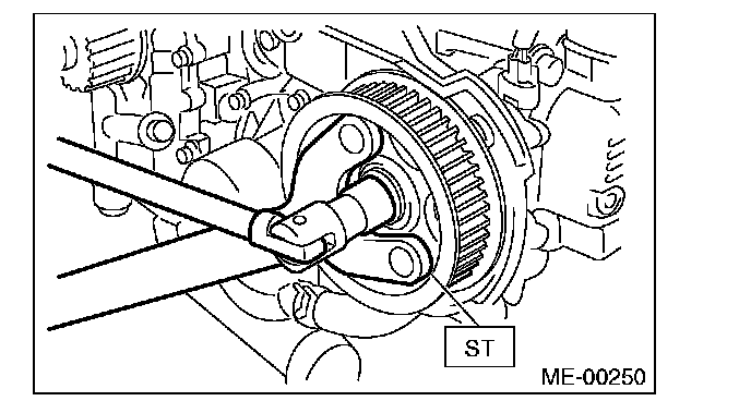 5) Use the ST to lock the cam sprocket, and remove the cam sprocket bolt.